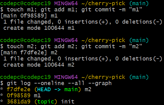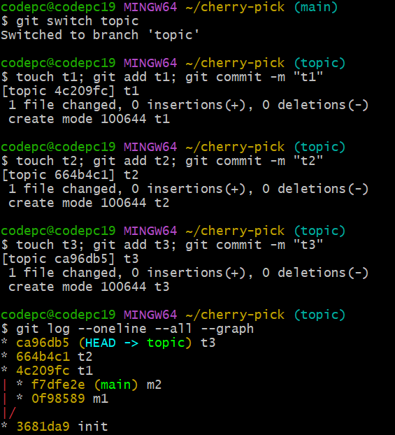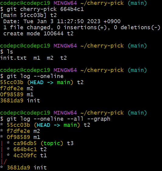 6. 여기까지 2개의 브랜치가 있고 topic 브랜치의 t2 버전에서 적용했던 내용을 main 브랜치에도 적용하고 싶을 때 cherry-pick을 사용합니다. (topic 브랜치의 여러 버전 중 하나를 골라와서 병합)
