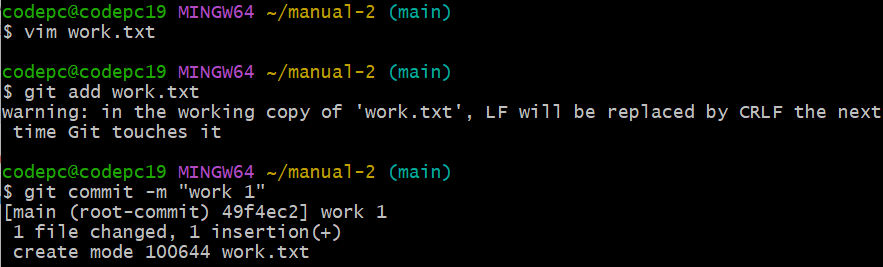 2. main에 'work 1'을 커밋합니다.(work.txt)
